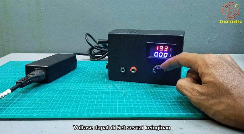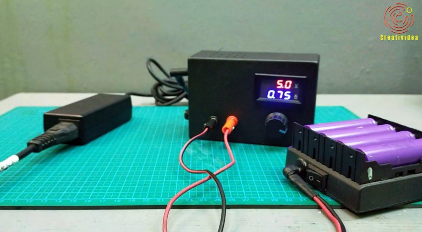 Питание с адаптера ноутбука проходит через предохранитель, переключатель и попадает на модуль понижающего преобразователя. Далее через диод, который служит для защиты от переполюсовки, и через амперметр напряжение поступает на выход. И далее подключается к нагрузке в виде аккумулятора или иного потребителя. Ампервольтметр имеет 5 проводов: 2 для питания, 3 для контроля тока и напряжения.