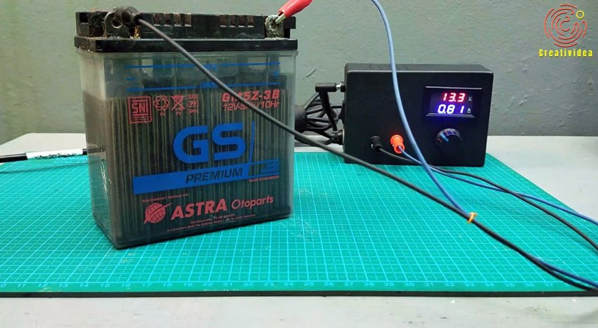 Подключаем мотоциклетный АКБ и проверяем зарядку.
