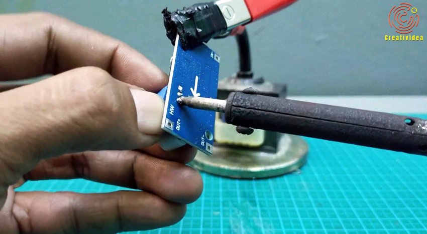 Теперь, вращая ручку переменного резистора движение передается на потенциометр и производится плавная регулировка. Припаиваем провода и подключаем к плате как было ранее.