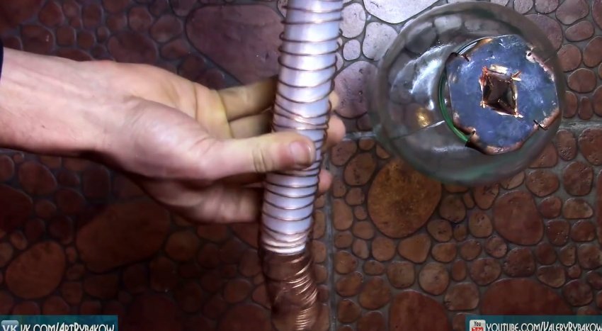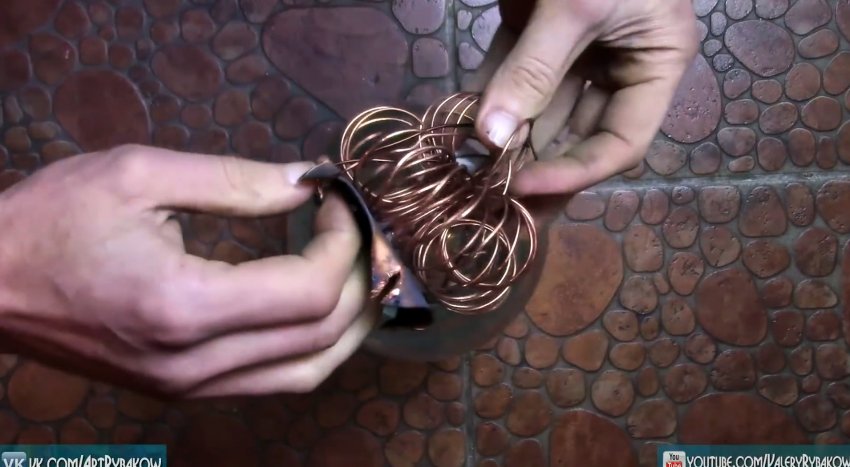 Для увеличения теплоотдачи свечи, требуется намотать медную проволоку на любую трубку диаметром 30-50 мм, чтобы получить длинную спираль. Затем та заворачивается в шар. Чем больше будет проволоки, тем лучше.