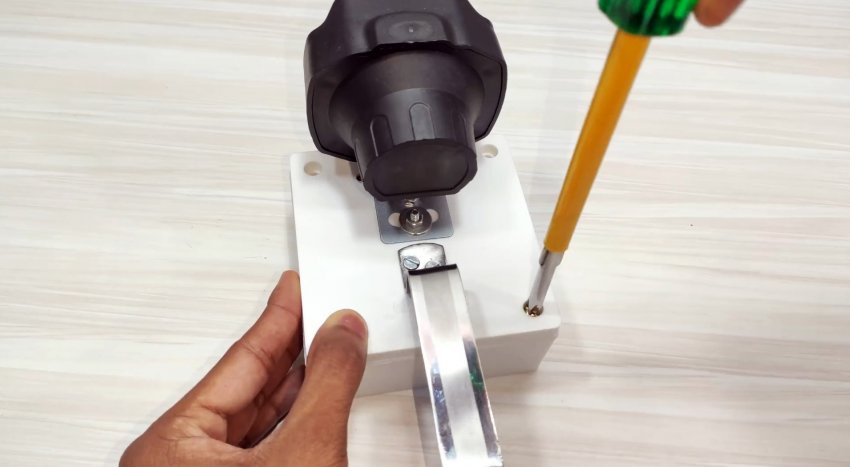 Сверлим в крышке коробки отверстия под фонарь и ручку, которую можно сделать из металлической полосы алюминия. Фиксируем все винтами.