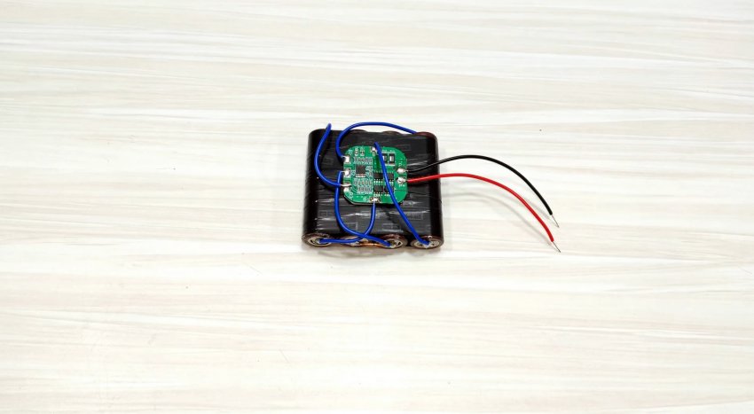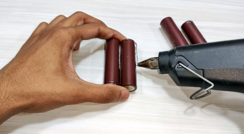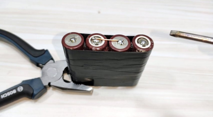 Обматываем изолентой. Припаиваем перемычки, чтобы соединить аккумуляторы последовательно.