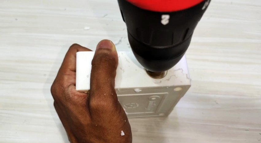 Берем распределительную коробку и сверлим отверстия под переключатель и разъем зарядки.