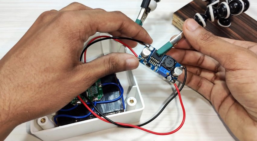 Припаиваем повышающий преобразователь между разъемом и контроллером зарядки.