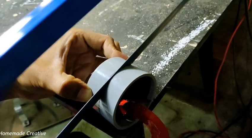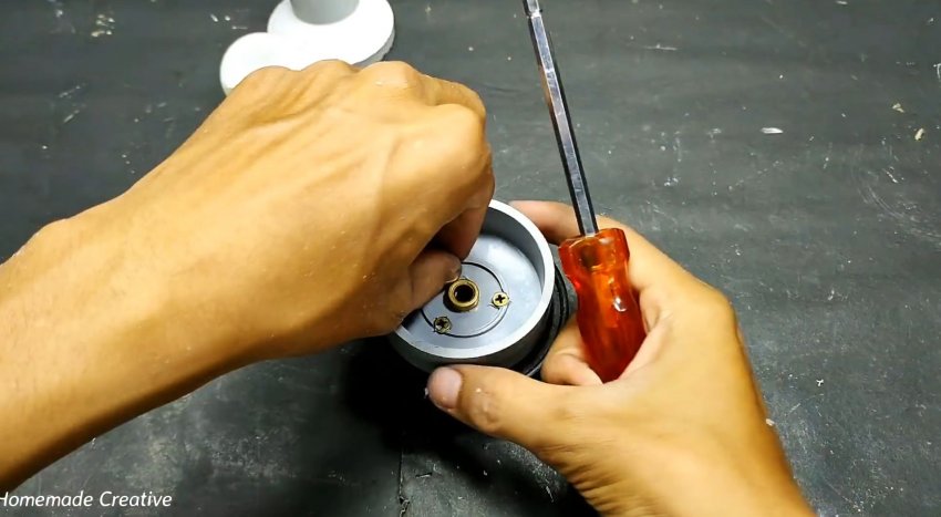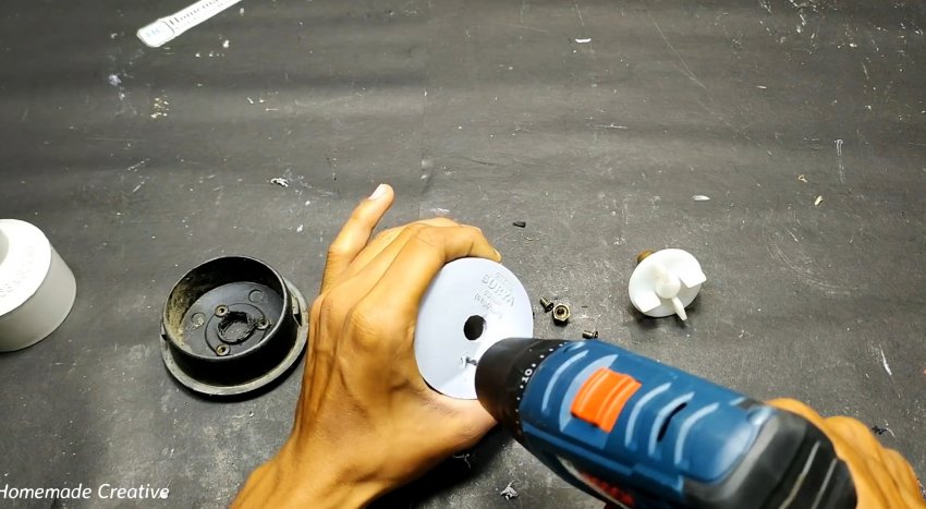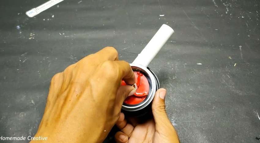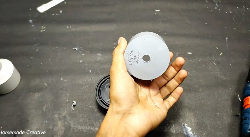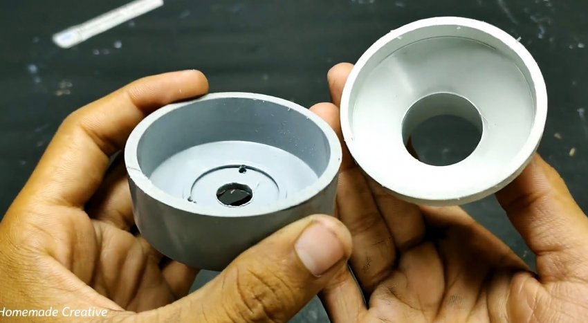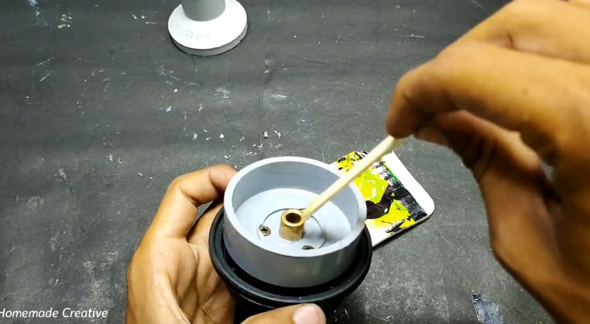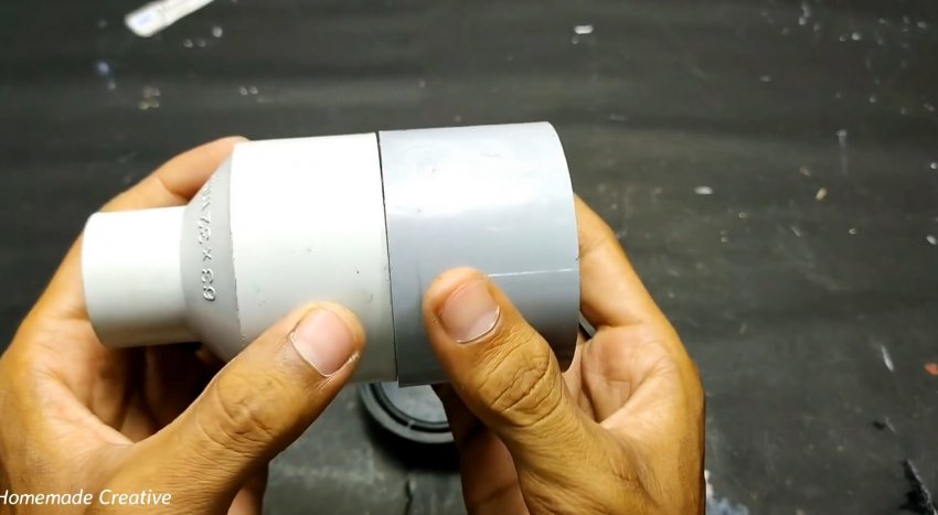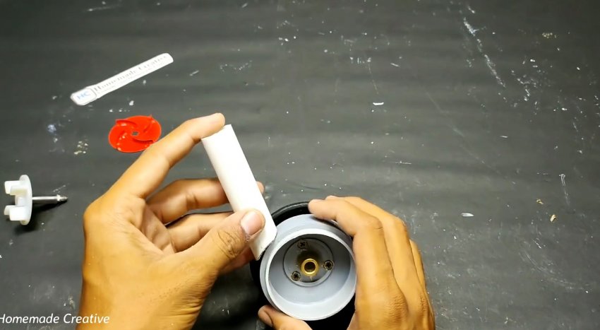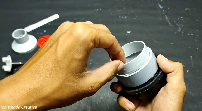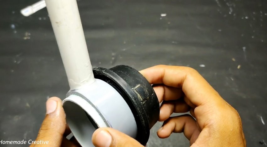 После этого шток с зацепом и крыльчаткой зажимается. В заглушку вставляется кольцо из трубки 63 мм. Оно служит для установки переходника, в который войдет труба 32 мм. Сборка всех деталей выполняется на клей.