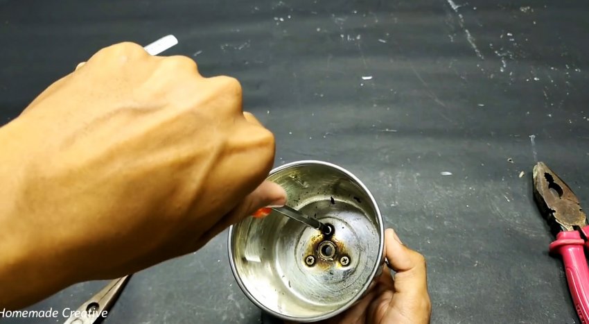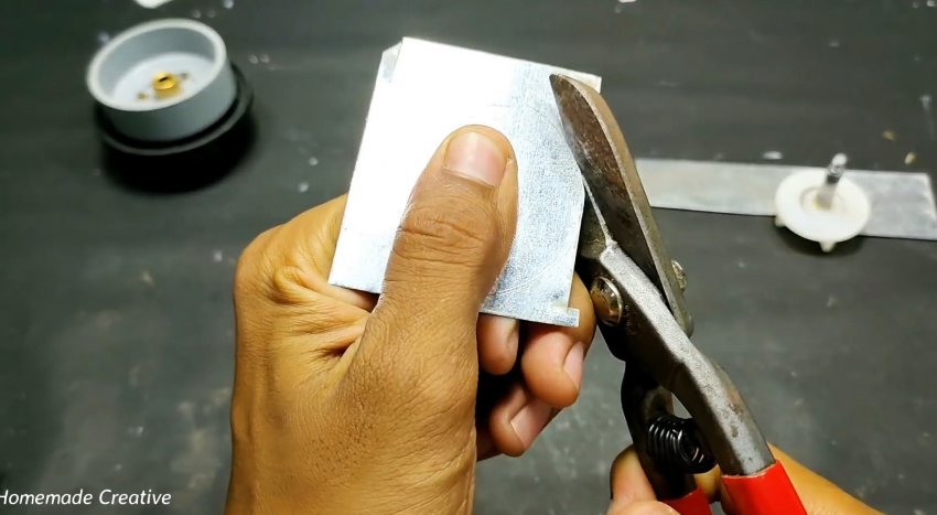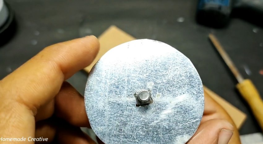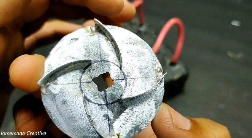 Из жести вырезается диск диаметром 50 мм для крыльчатки. К нему припаиваются лопасти в виде подогнутых полос, из этого же материала. Чтобы припой держался, детали нужно отшлифовать.