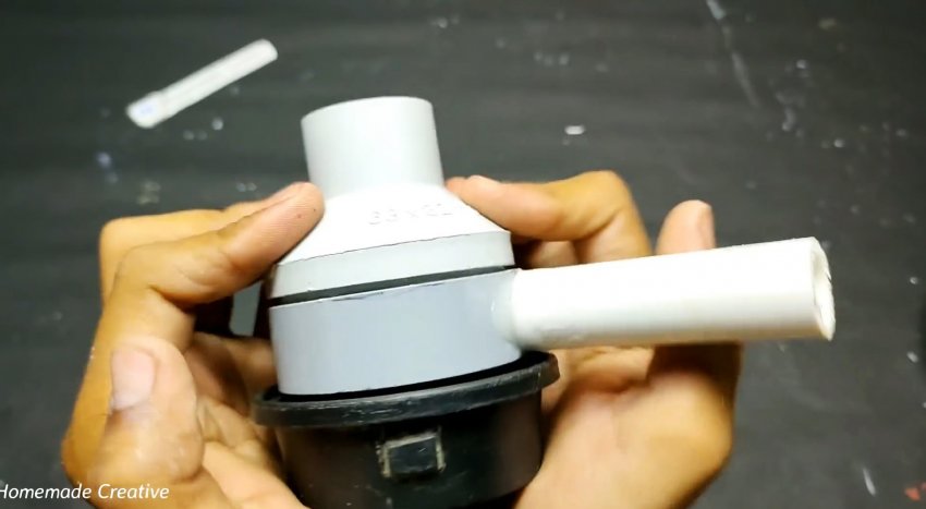 После этого корпус помпы вставляется в блендер вместо контейнера. К трубе 32 мм подсоединяется шланг, который нужно опустить в воду. После включения помпа сама затянет воду в корпус, и подаст ее под давлением через боковую трубку 20 мм.