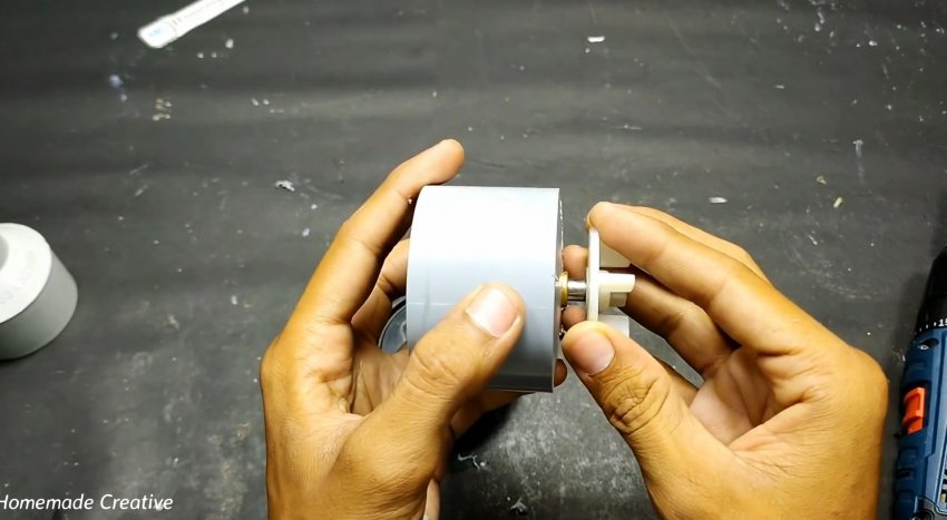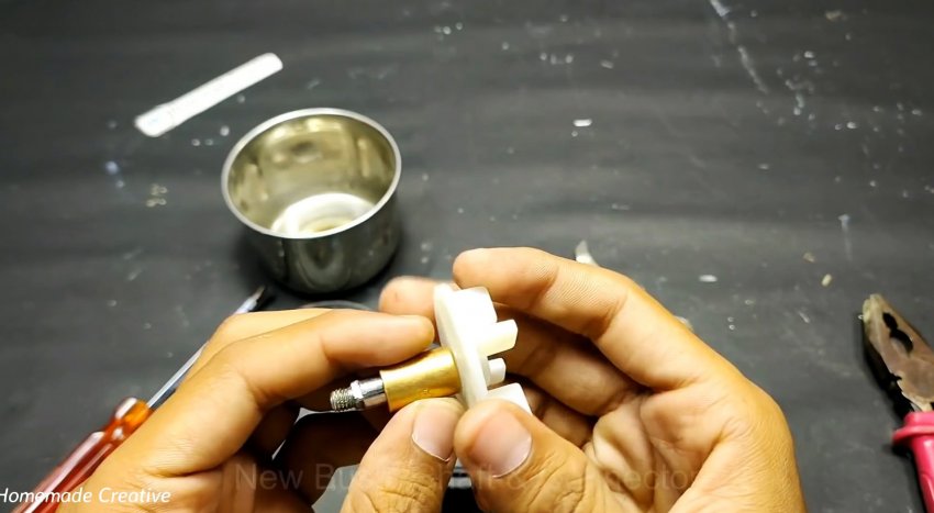 В ранее вклеенную втулку вставляется шток с ответной частью зацепа вала двигателя. На обратной стороне изнутри надевается самодельная крыльчатка для примерки.