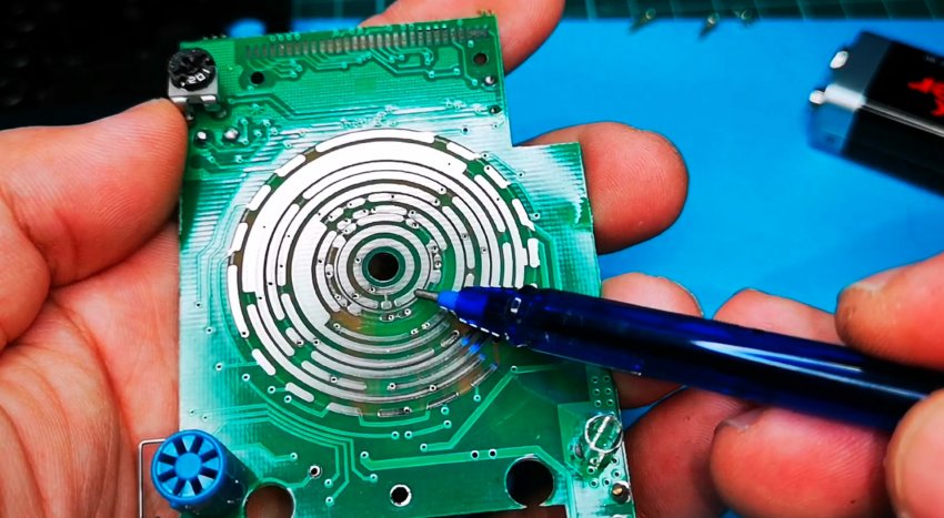 Так как мультиметр выключается когда переключатель режимов находится в центральном положении, значит на плате должны быть дорожки, которые будут замыкаться бегунками в любом положении кроме центрального. Это будет подача питания от батарейки на схему. В данном примере это два первых кольца. Они замыкаются во время работы.