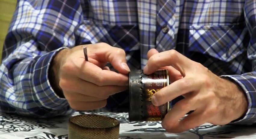 В самой банке нужно проткнуть отверстия шилом толщиной 2 мм. Они пробиваются по окружности с шагом 8 мм на расстоянии от верхнего бортика 15 мм. Каждое из них нужно слегка вывернуть вверх, чтобы направлять пламя.