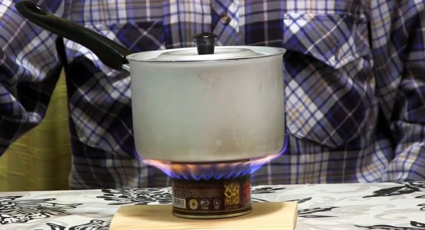 Пламя внутри израсходует весь воздух и сразу же погаснет. Дальше остается только поджечь снаружи пары спирта, выходящие через боковые отверстия. После этого на горелку можно ставить чайник, кастрюлю или другую посуду.