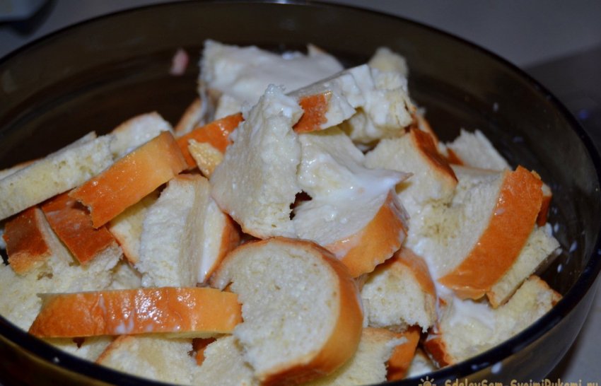 Батон (хлеб пшеничный) ломают на куски, замачивают в молоке.