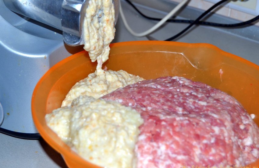 Размоченный батон пропускают через мясорубку или тщательно размалывают блендером. Также перемалывают репчатый лук, чтобы не было кусочков, только сочность и аромат.