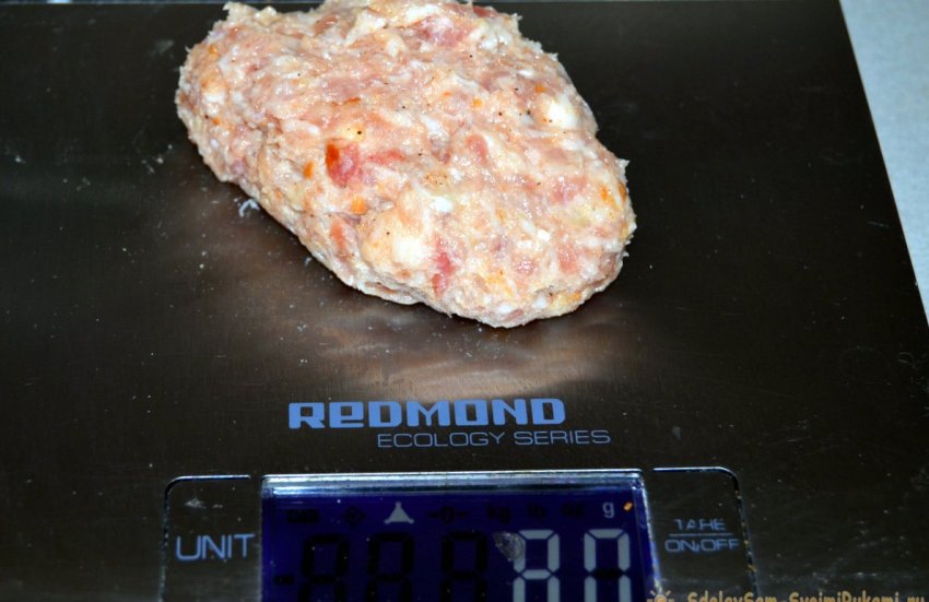 Формируют котлеты, весом по 80 грамм. Используют кухонные весы, чтобы получить одинаковые по весу полуфабрикаты.