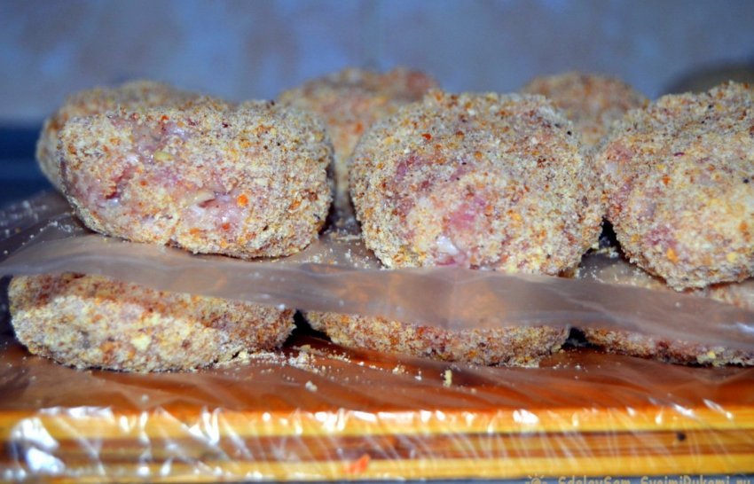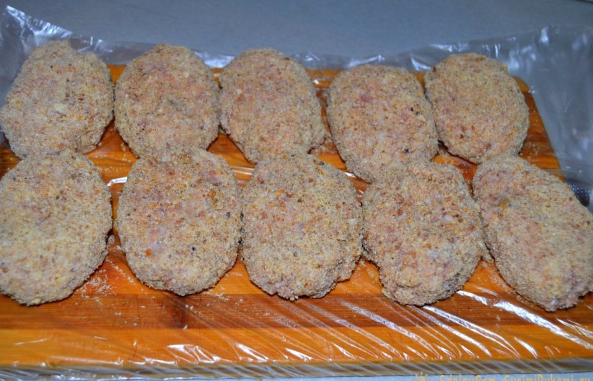 Обваливают в сухарях, укладывают на разделочную доску в один ряд. Доску предварительно оборачивают в полиэтиленовый пакет, чтобы котлеты не прилипали.