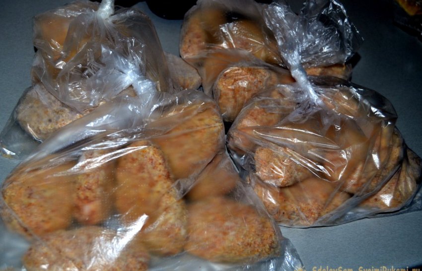 Замороженные полуфабрикаты фасуют в пакеты, выбирая оптимальное для хозяйки количество. Впоследствии выкладывают на смазанный маслом противень в замороженном виде и запекают в духовке при 200 градусах в течение 40 минут. Быстро, легко, удобно.