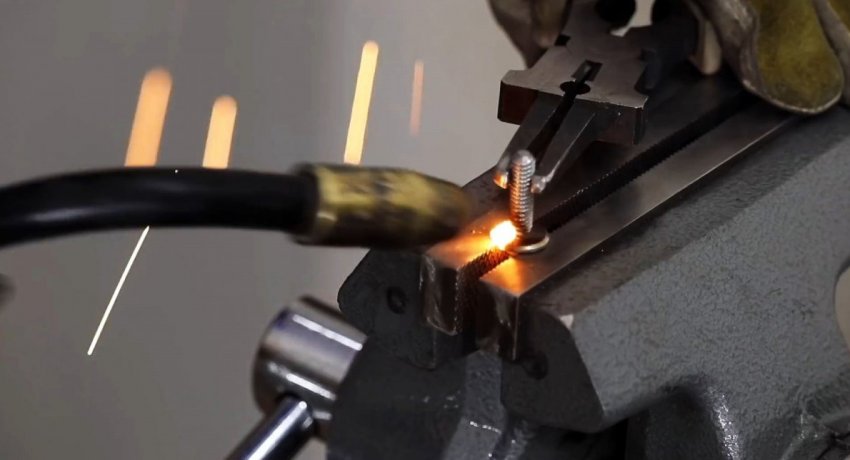 Затем необходимо сварить шляпками друг к другу 2 болта. После этого на циркуле делаются насечки как на линейке.