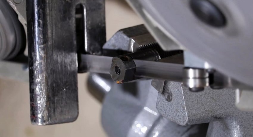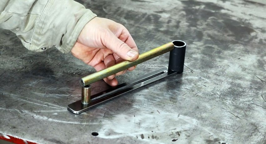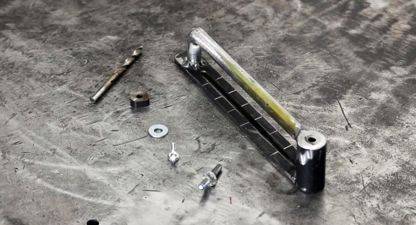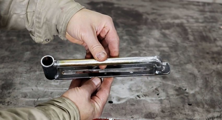 Перед вырезом уже на саму заготовку приваривается отрезок тонкой трубки длиной 35-40 мм. Затем между полученными стойками приваривается перекладина, чтобы получить ручку.