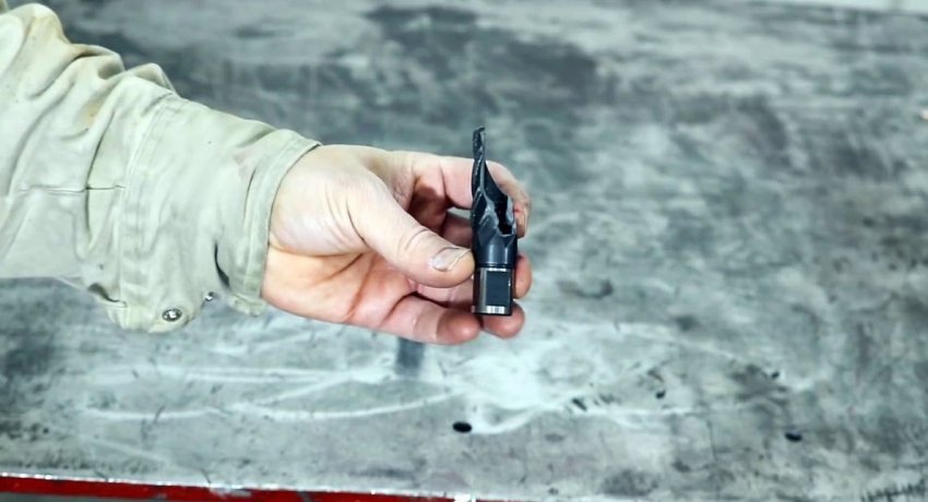 Затем во втулку устанавливается обычное сверло с ограничителем из части хвостовика коронки, чтобы оно не проваливалось.