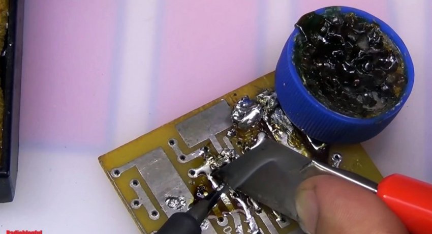 Затем берем ненужную плату, и насколько это возможно, наплавляем на нее припой и канифоль. Конечно, сделать это не луженным жалом немного трудновато.