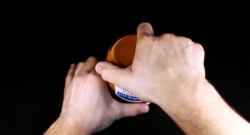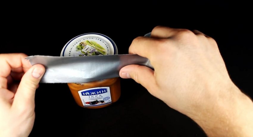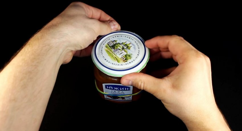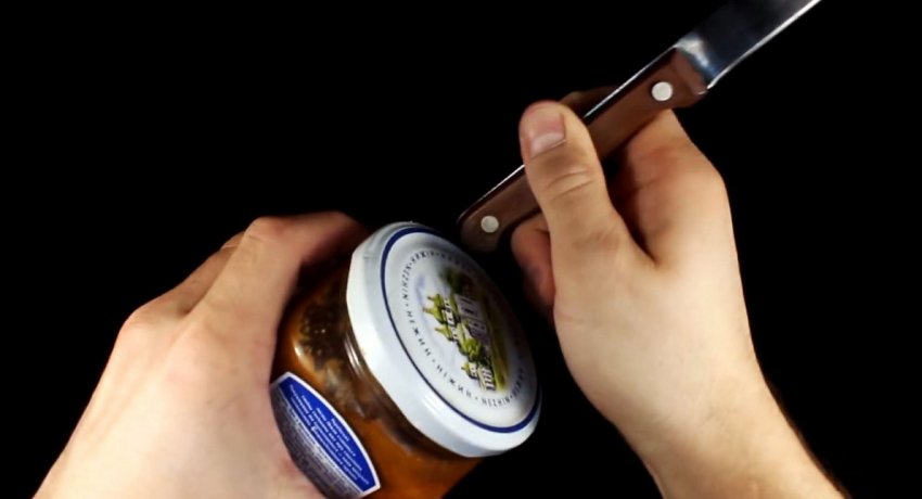 Можно постучать по крышке с боков и сверху рукояткой ножа. Это поможет ослабить резьбу, и прикладываемого усилия будет достаточно, чтобы скрутить крышку.
