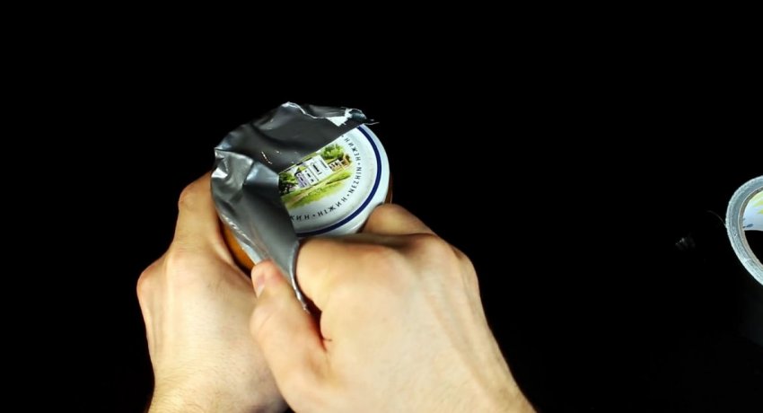 На половину окружности крышки приклеивается скотч. Потянув за него, ее можно открыть. Это потребует приложить усилие, но более развитых мышц, поэтому все получится.