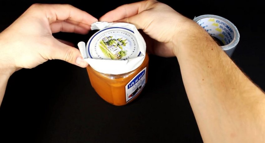 Если открыть банку не получается, поскольку пальцы скользят по крышке, возьмите кусок скотча и сложите его вдоль пополам, клейкой стороной наружу. Далее он обматывается вокруг крышки. С такой липки подкладкой пальцы уже не соскользнут, поэтому открыть банку будет легче.
