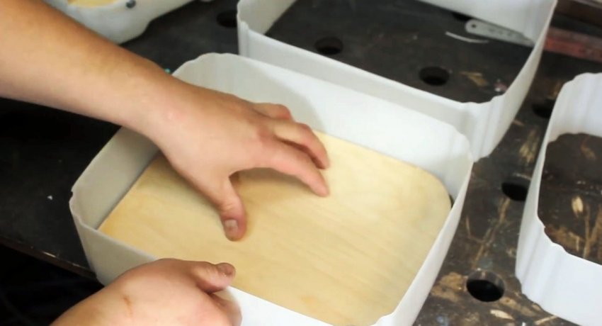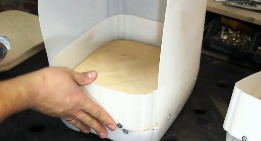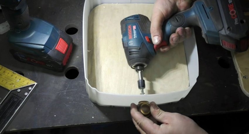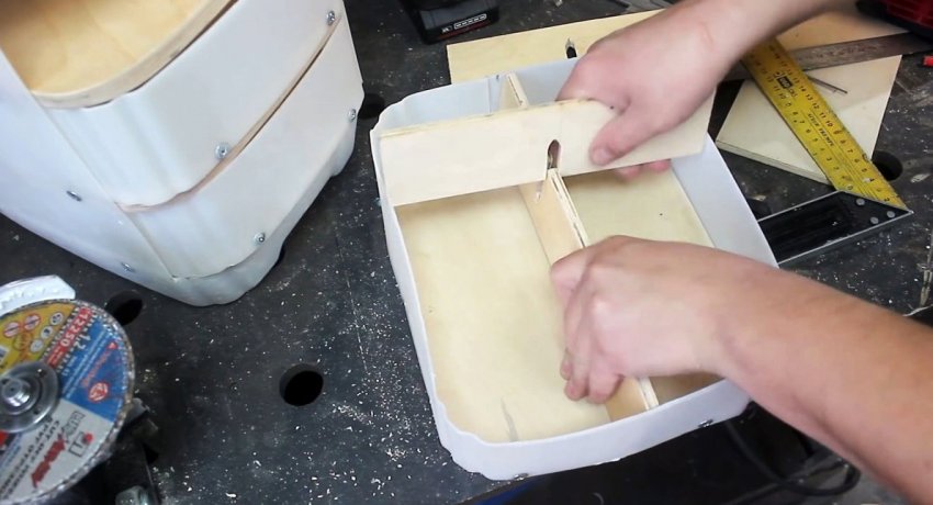 Кольца разрезаются поперек, и к каждому из них прикручивается дно. Разрез нужен, чтобы сузить ящики, и они могли входить в корпус органайзера. Также из фанеры вырезается 2 полки, которые прикручиваются к канистре, чтобы на них ставились ящики. Оставшаяся внутренняя вставка закрепляется над верхним ящиком у горловины.