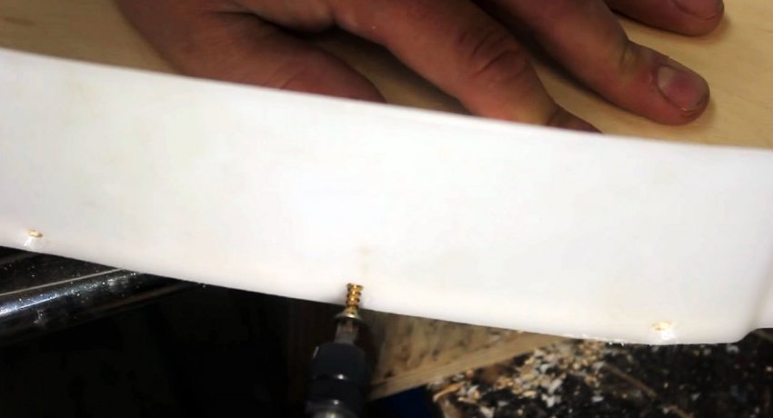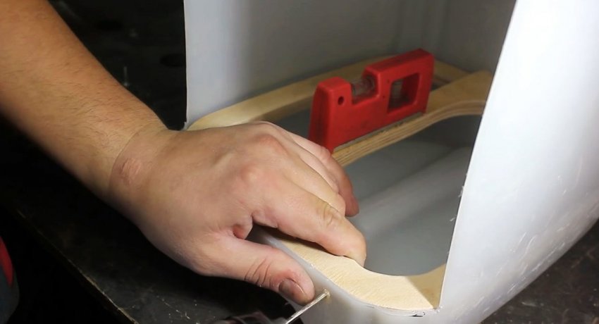 Вставка в виде кольца располагается у дна канистры по нижней кромке окна. Она выравнивается горизонтально и прикручивается к стенкам саморезами.
