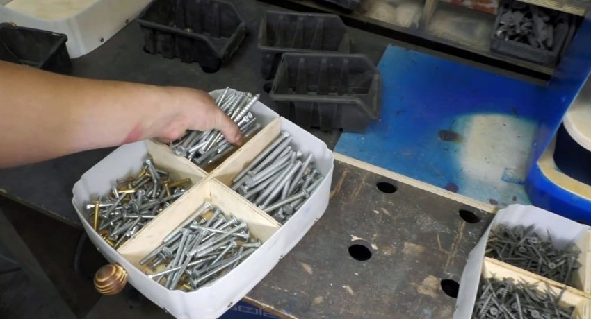 Затем из фанеры изготавливаются перегородки для разделения ящиков. Каждый отдел будет использоваться для определенного размера болтов, гаек, саморезов.