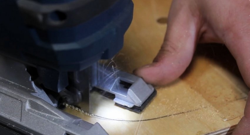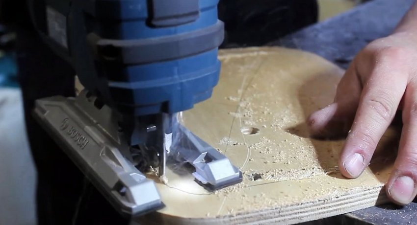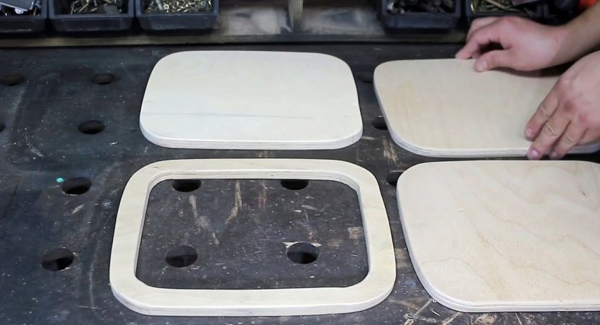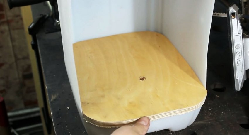 Из фанеры выпиливается 5 вставок под внутренний размер канистры. Одна из них должна быть в виде кольца. Для удобства их разметки можно использовать срезанное дно с такой же канистры.