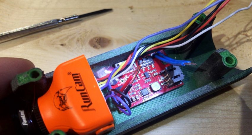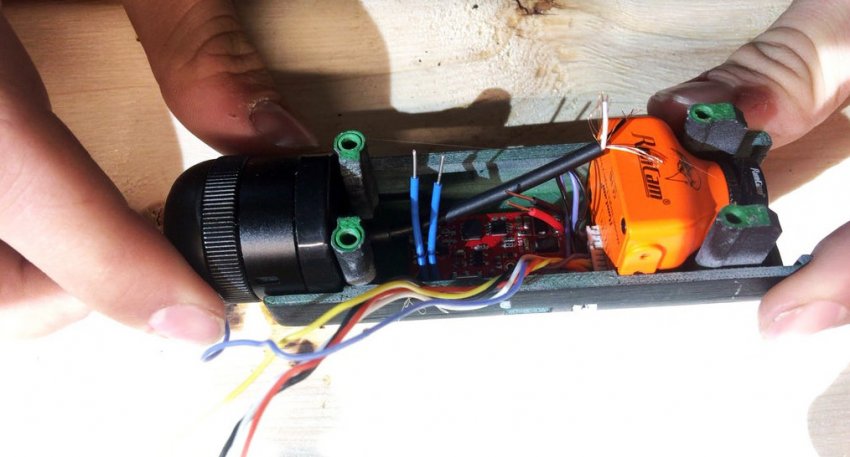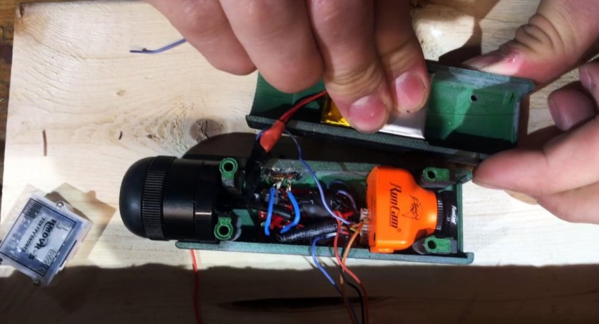Питание 5 В подается на камеру и видео монокуляр. С камеры идет выход видео сигнала на вход окуляра. К модулю припаян выключатель питания.