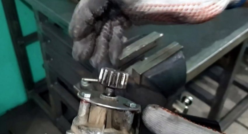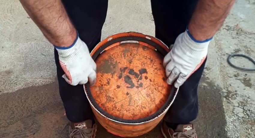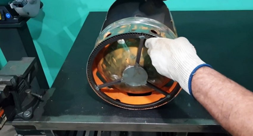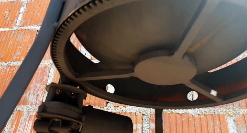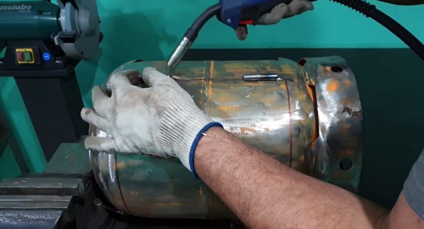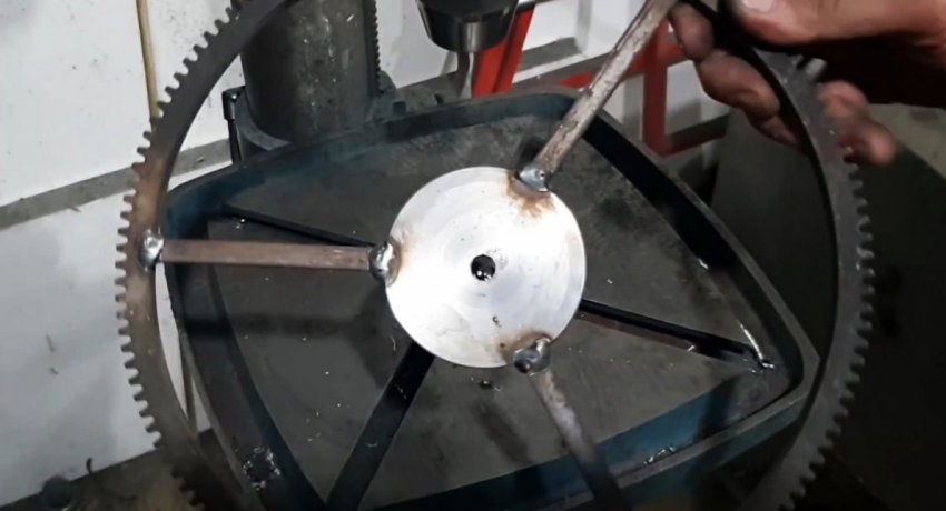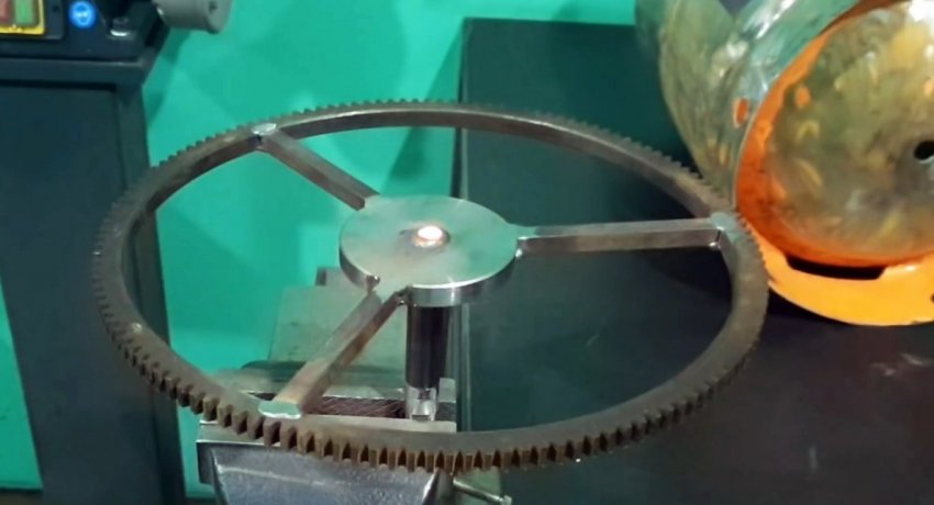 Затем он зачищается от краски. На следующем этапе нужно сделать поворотный механизм. Для этого в зубчатый венец ввариваете центр в виде диска и 3 спицы из прутка. Полученное колесо просверливается. Также нужно сделать отверстие в дне баллона.