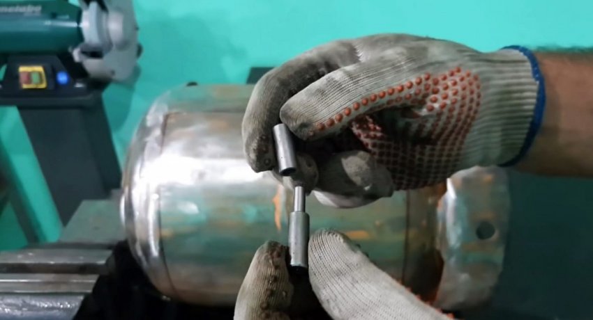 Теперь колесо вставляется осью в дно баллона снизу. Изнутри ее втулка приваривается. Шов требуется сделать герметичным.