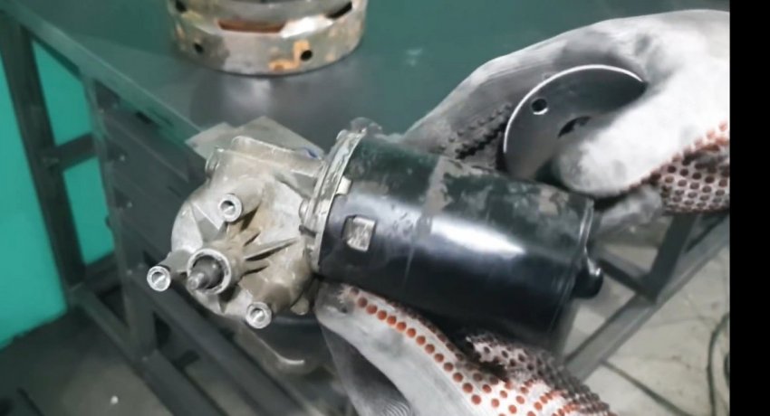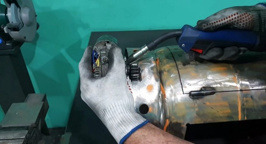 На мотор-редуктор от стеклоочистителей устанавливается шестерня. Затем под него делается крепежная плита и приваривается к баллону так, чтобы двигатель мог вращать венец. Делается все также как в бетономешалках.