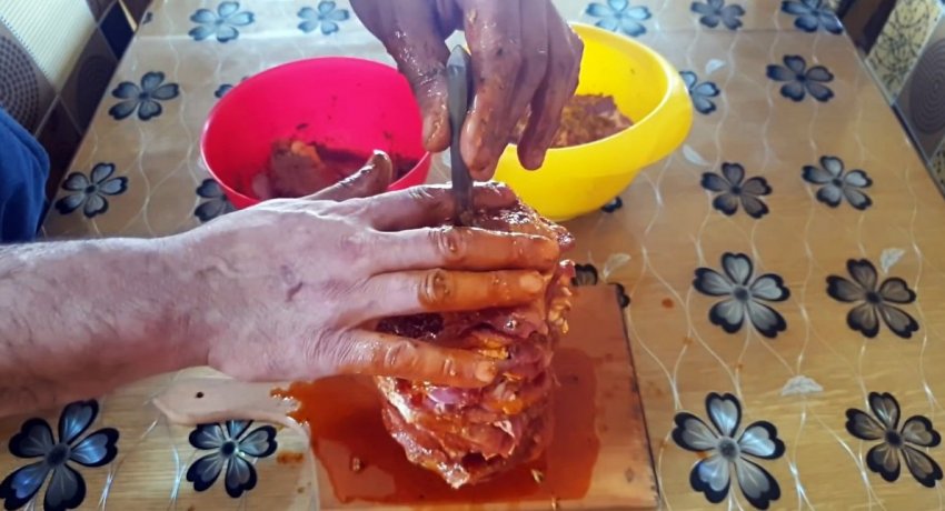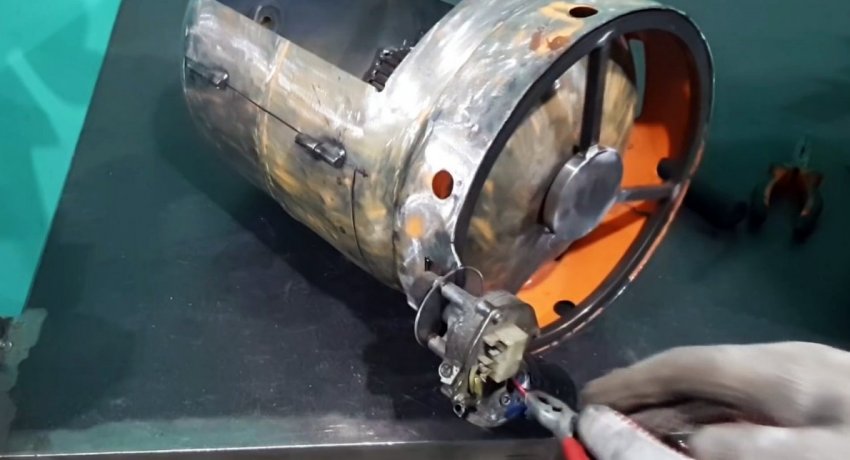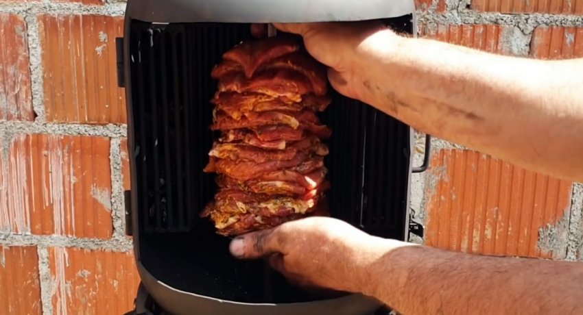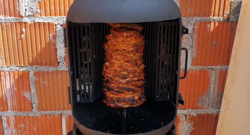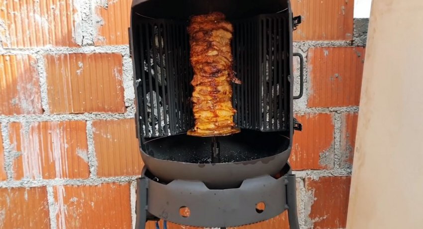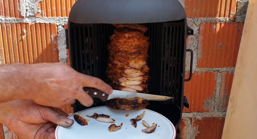 После этого на мотор-редуктор подается напряжения, чтобы он начал вращать мясо.