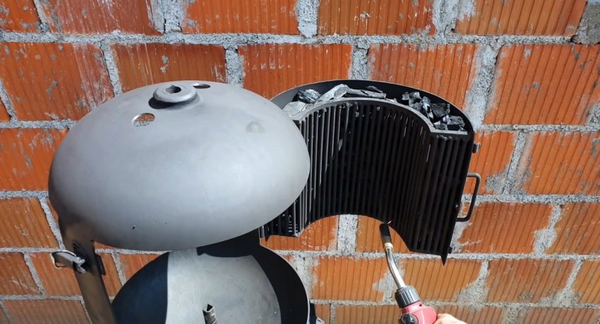 Для использования гриля, нужно открыть его дверцу и заполнить ее углем. Тот разжигается горелкой и она закрывается.