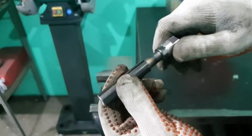 Гриль окрашивается термостойкой аэрозольной краской. Пока она сохнет, нужно сделать шампур для мяса. Он представляет собой штырь из нержавеющей стали с опорной площадкой внизу. Под ней он должен иметь ответную часть, чтобы плотно входить в профильную трубу на оси поворотного механизма.