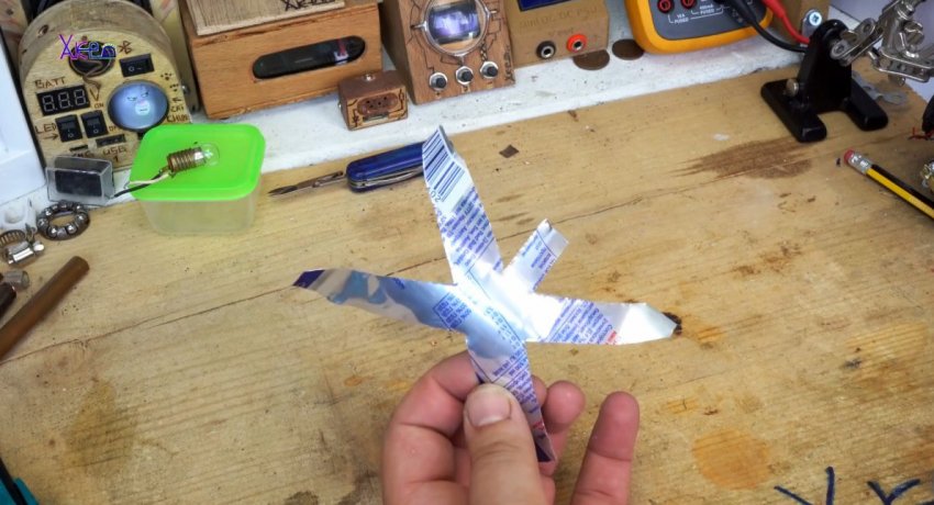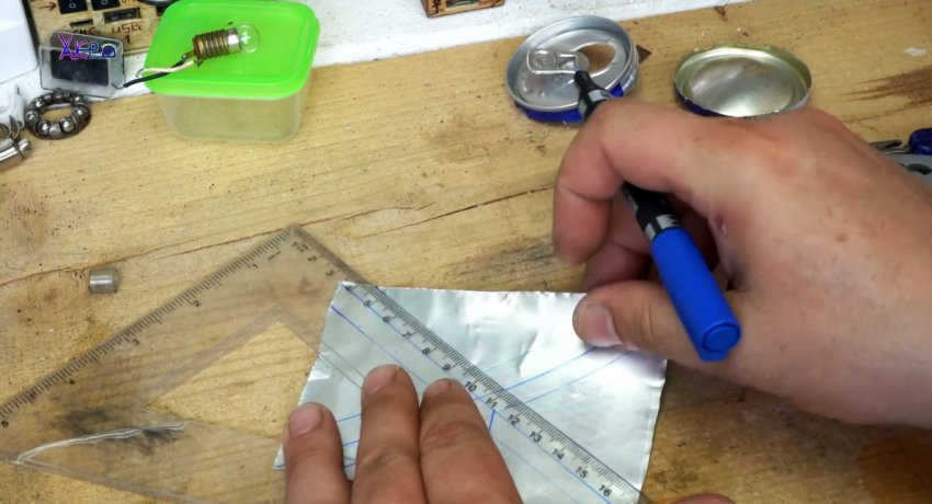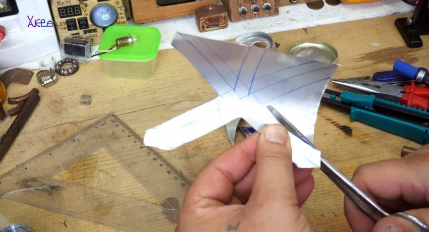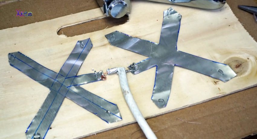 На заготовки по диагоналям наносится разметка в виде перекрестья с одним боковым ответвлением. Затем по ней вырезаются 2 детали антенны.