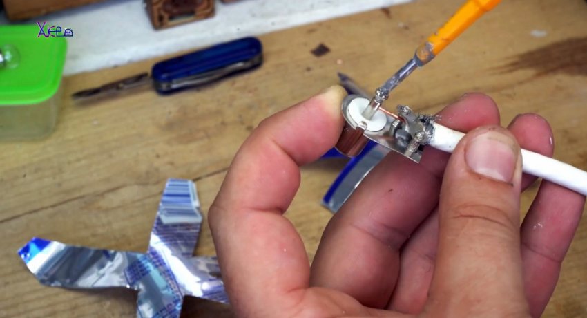 Между элементами антенны крепится свободный конец кабеля. Его центральная жила должна соединяться с одной частью антенны, а обмотка с другой. Можно даже ничего не паять. Жилы достаточно плотно прибить к металлу степлером. Такая простейшая антенна, собранная за 10 минут, будет работать не хуже покупной.