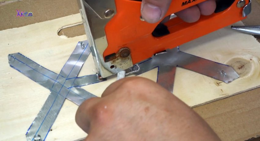 Далее нужно закрепить заготовки антенны на плоскости. Для этого отлично подходит кусок фанеры, так как их можно к ней просто прибить степлером.