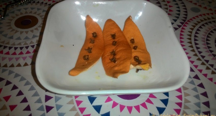 Можно использовать и корки от апельсина, лимона, грейпфрута. Для начала проткнуть на корке дырочки вилкой, затем вставить туда палочки гвоздики. Разложить по шкафам, полкам, под раковиной и другим местам.