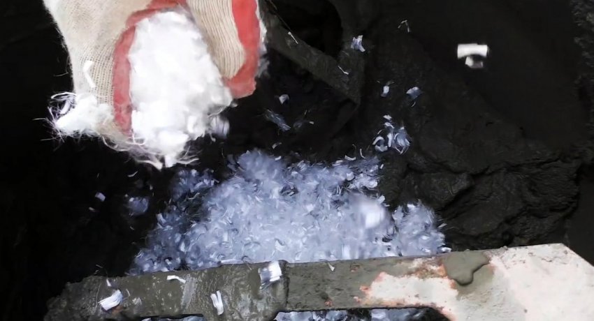 Для третьего образца в бетономешалку добавляется фиброволокно. После вымешивания бетон также отбирается в пустое ведро.