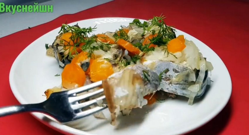 Кладем пару кусочков рыбы, засыпаем морковью.