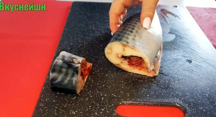 Отрезаем голову и хвост. Удаляем всю требуху, потом промываем.