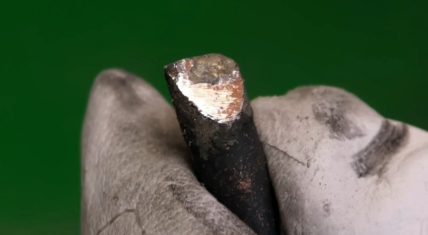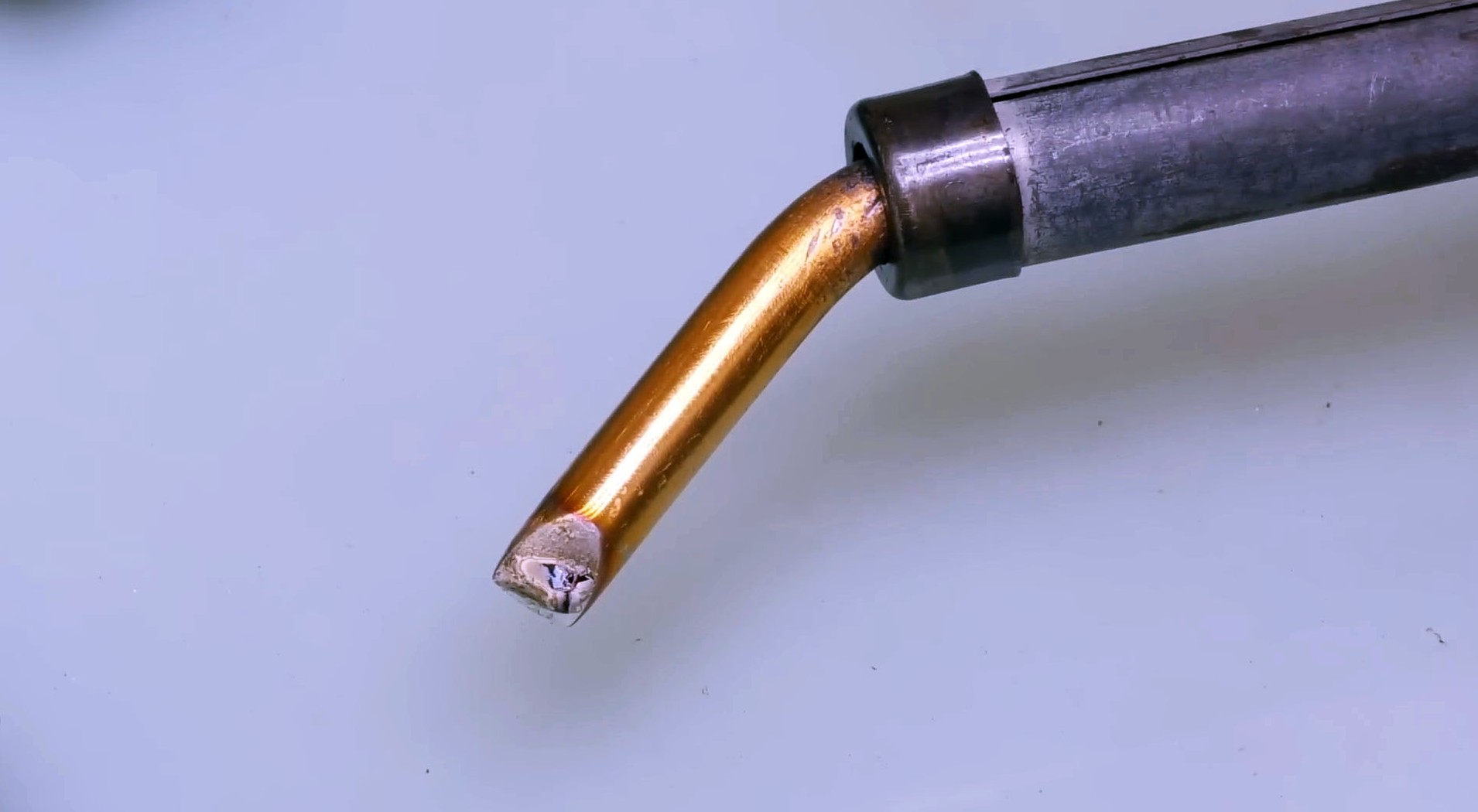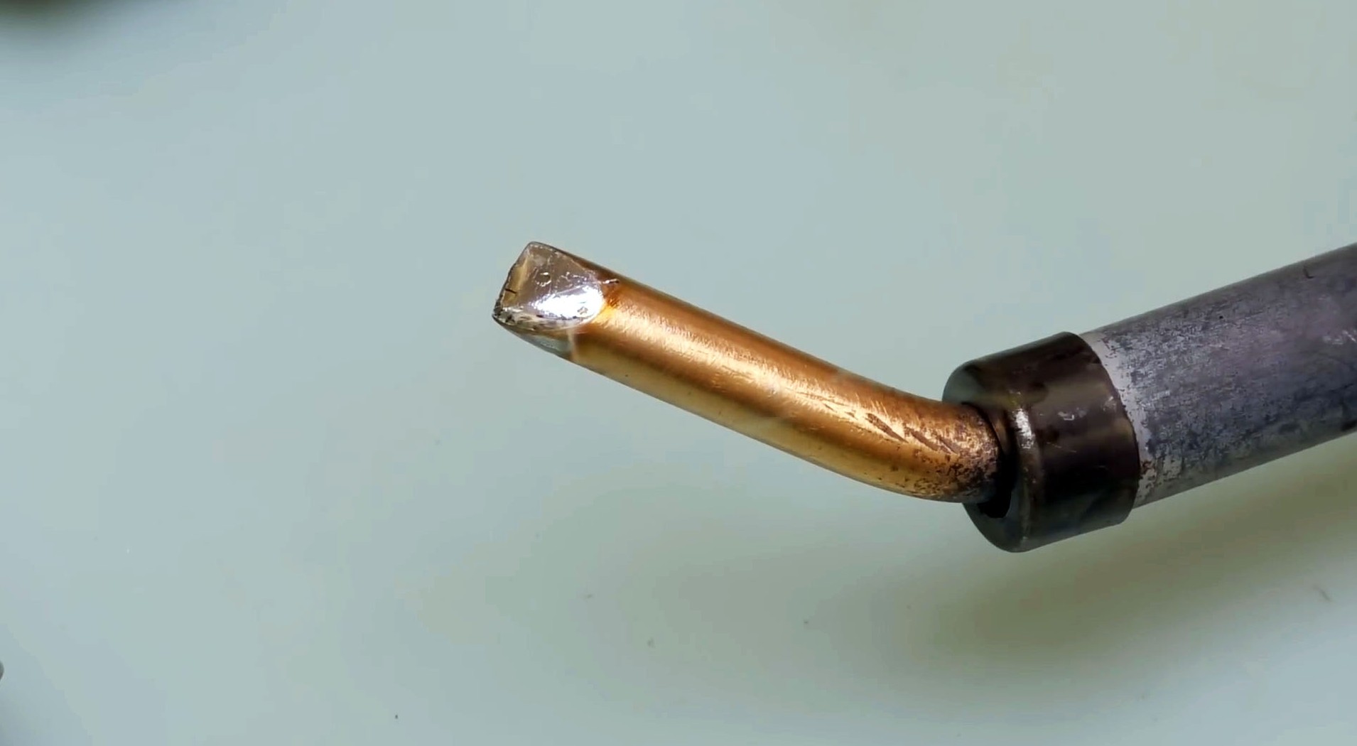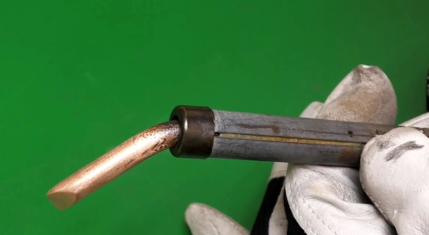 Но не трогайте рабочую зону — она уже готова к работе. Затем включите нагрев и посмотрите, как медь меняет цвет и темнеет, образуя защитный оксидный слой. По такому жалу припой не растекается, залуженной остается только рабочая область. Работать таким паяльником проще, а пайка будет аккуратнее.