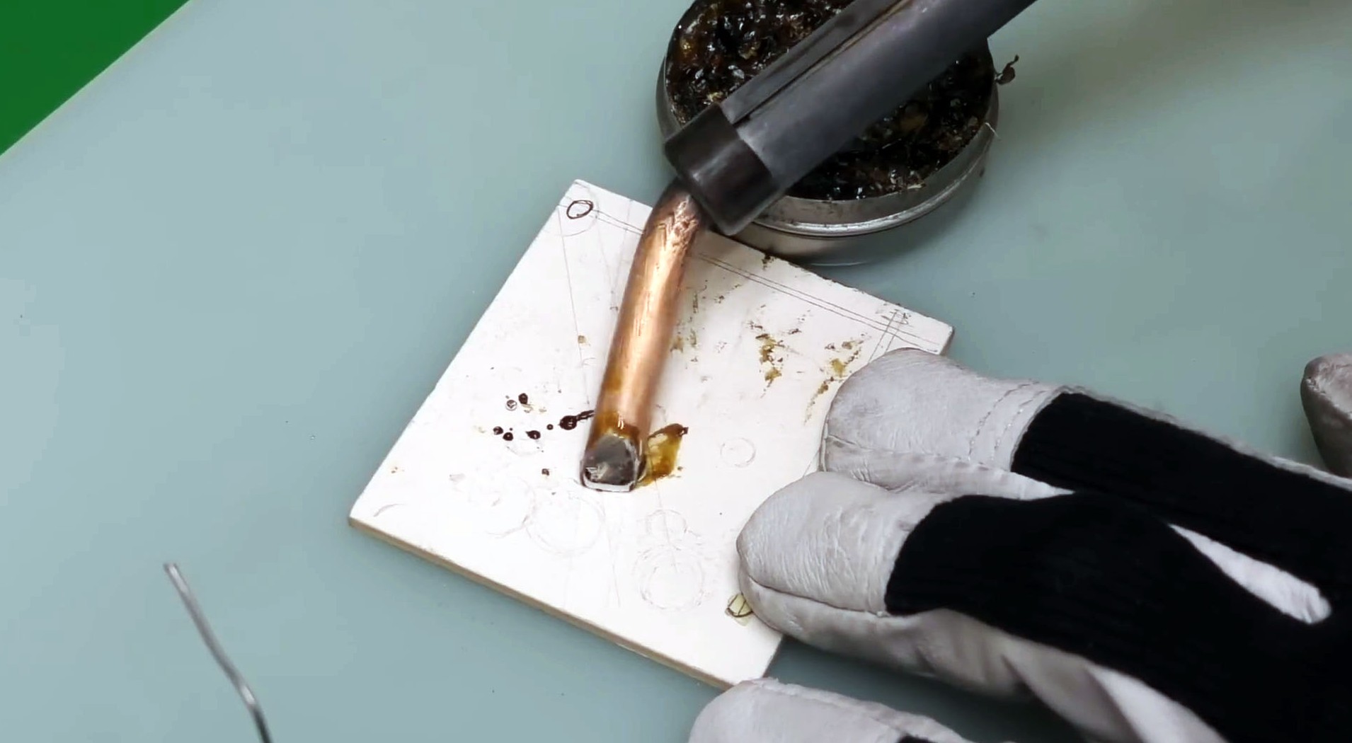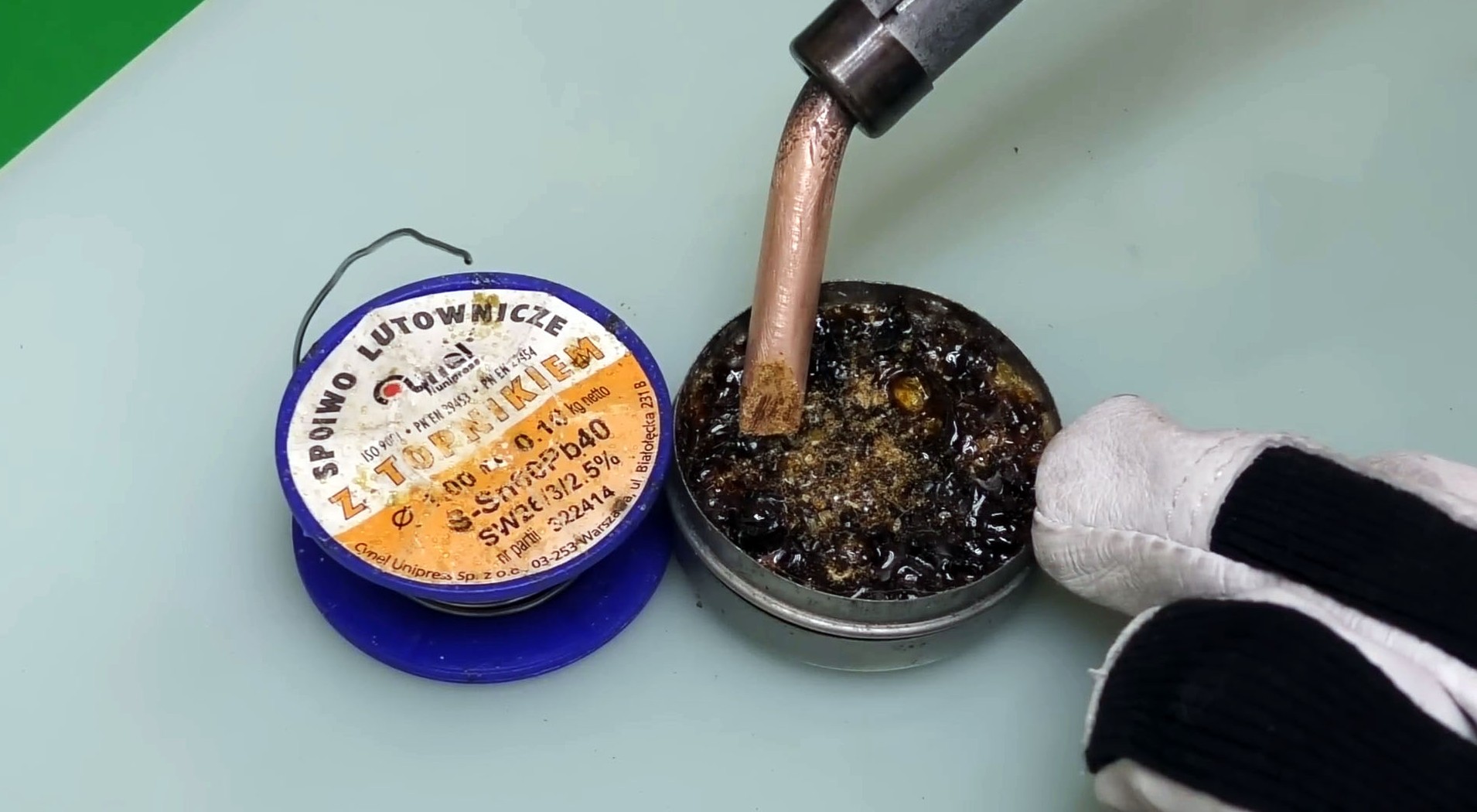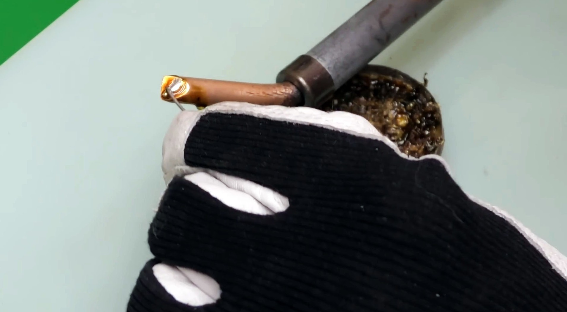 Приставьте холодный паяльник к канифоли и дождитесь, когда она начнет плавиться. Температура размягчения канифоли ниже той, при которой медь окисляется. Ваша задача — покрыть канифолью рабочую часть жала, пока паяльник не прогрелся. Это защитит металл от окисления.