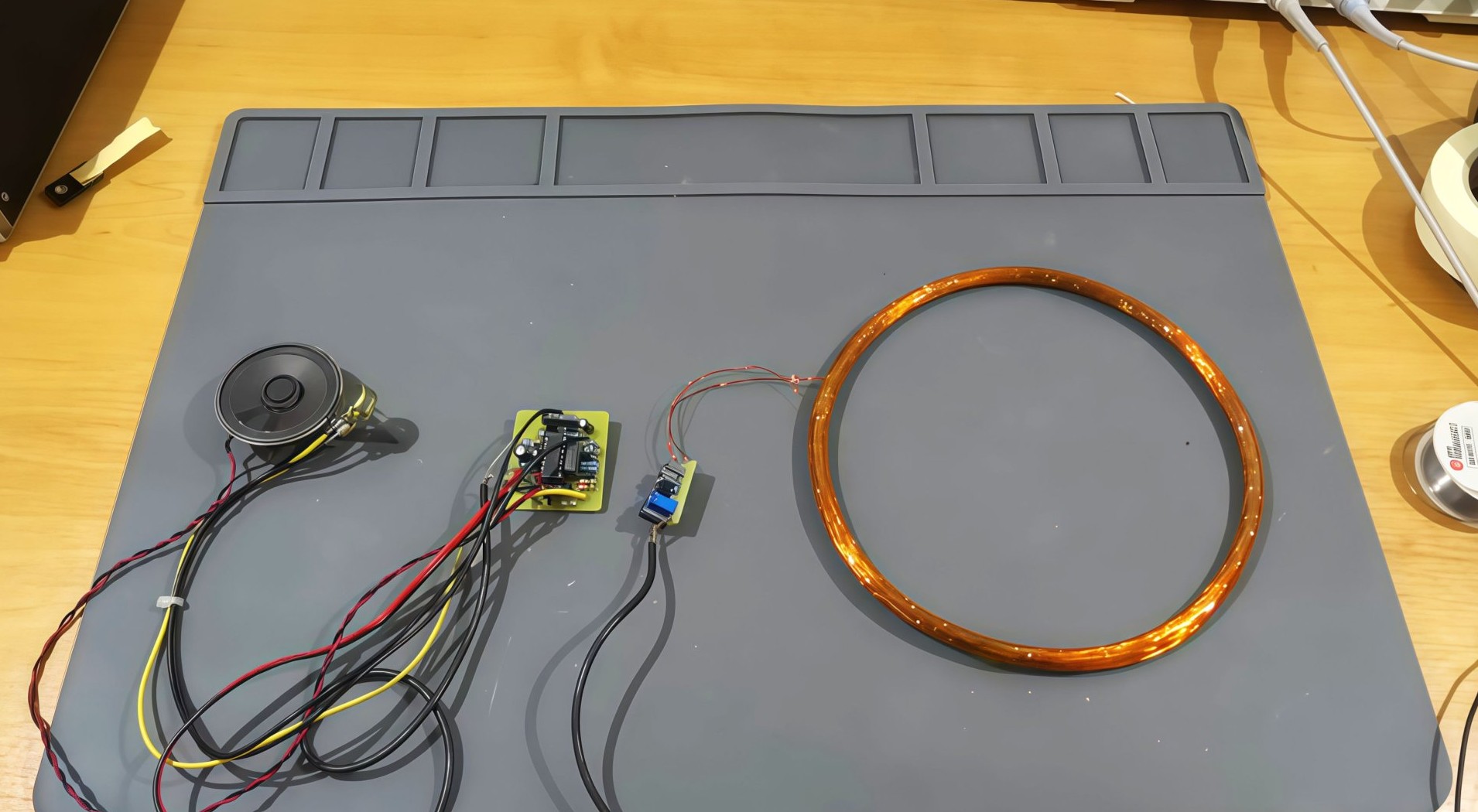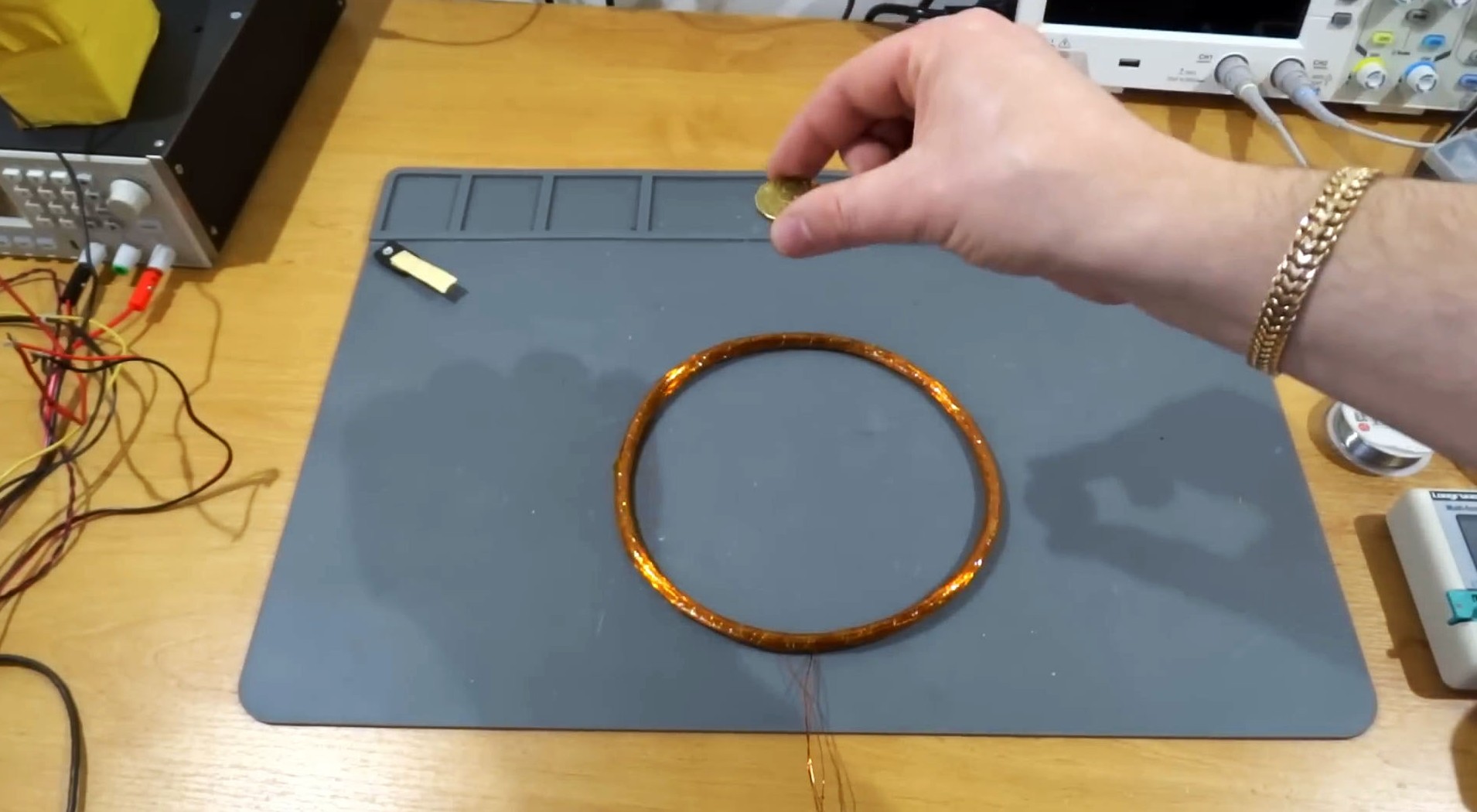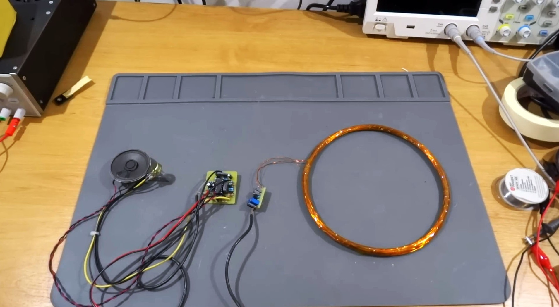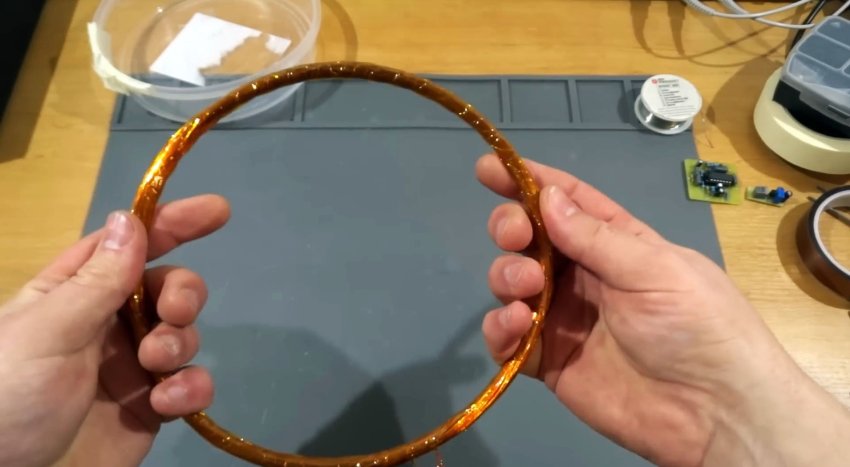 Катушка намотана на круглую оправу диаметром 17 см, но можно выбрать и другой размер. Провод для катушки должен быть от 0,2 до 0,5 мм, чтобы она была удобной в использовании.