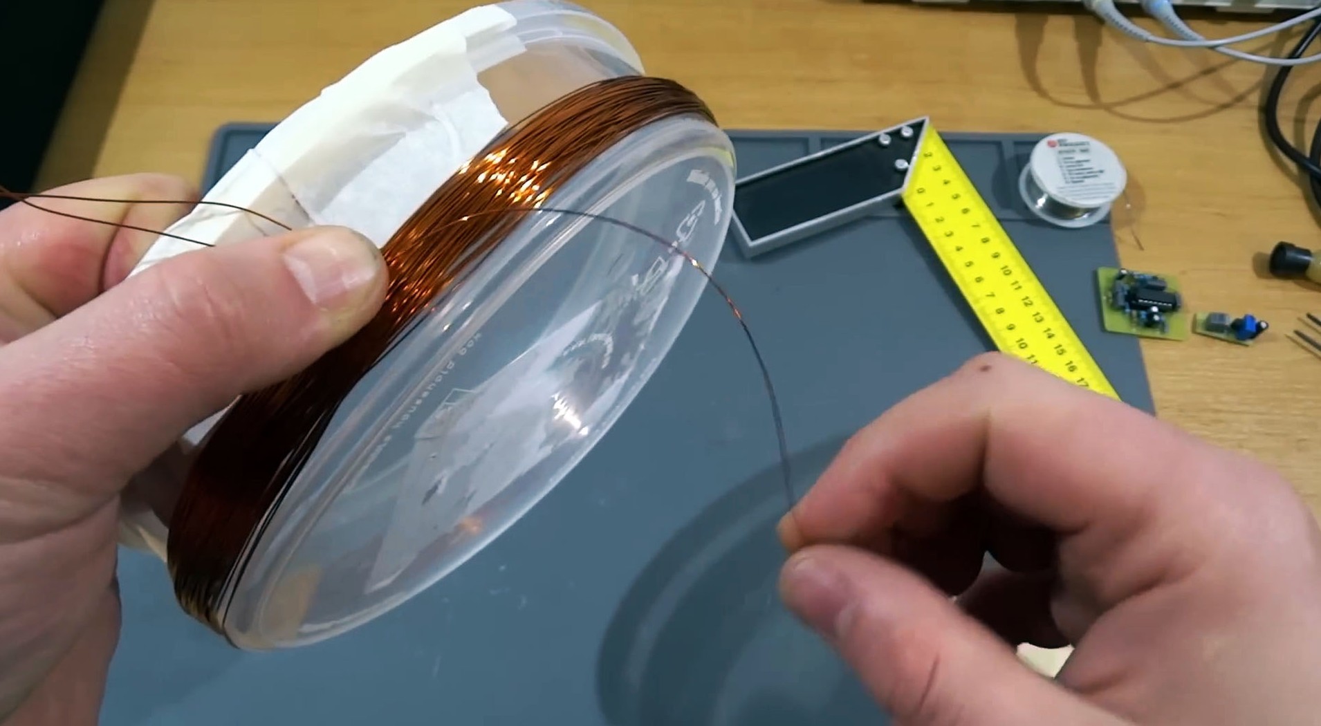 После намотки катушку нужно обмотать изоляционным материалом и пропитать парафином или клеем для лучшей целостности. Затем три вывода катушки припаиваются к маленькой плате.
